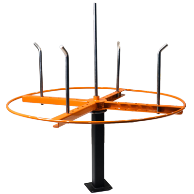 Friction disc reduces free wheeling and resultant tangling of wire from the decoiler before the wire length measurement device. Removal of disc allows free rotation. Height from base to ring is 12-1/2″. Made from durable welded steel.